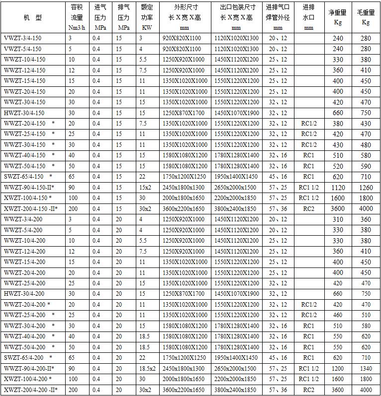 Oil-free High Pressure Oxygen Compressor Technical Specification Table Models marked with * are water-cooled.